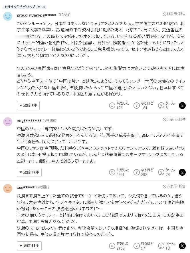 日本雅虎体育的球迷对董路的言论进行了讨论,其中点赞数超过2000的一条评论认为:“这种论调太过幼稚,明明一路打进决赛的所有比赛都用的5-3-2,现在又说这些。”国足本届杯赛打进决赛,凭借的正是532阵型,尤其是面对澳大利亚和乌兹别克斯坦等球队的时候,国足正是依靠低位防守才能力保球门不失,在半决赛之前的4场比赛国足能够在只打进1粒进球的情况下进入4强,防守无疑是最关键的原因。