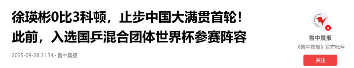 徐瑛彬0比3科顿,止步中国大满贯首轮!此前,入选国乒混合团体世界杯参赛阵容——鲁中晨报