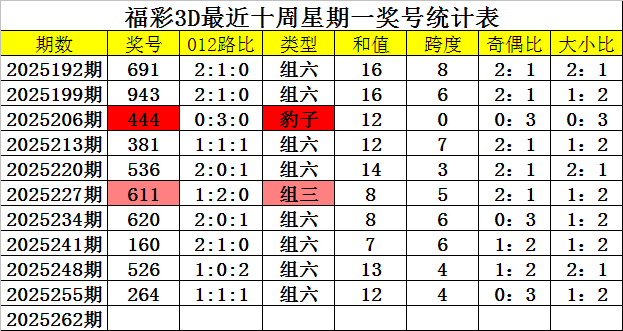 奖号类型分析:从近期周一开奖数据分析,组六近期热出,十周内出现8次,上周一为组六号码,组三出现1次,表现相对较冷,本周一预计继续开出组六号码。