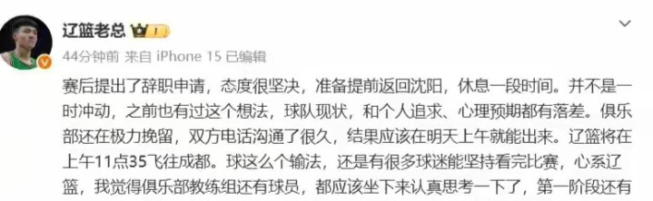 杨鸣在1月25号打完新疆就提交了辞呈。那天辽宁只得了59分,最后一节才拿4分,破了队史最低纪录。俱乐部24小时内批了,速度比发个通知还快。他没走远,还是省篮协的法人,但教练席上那把椅子,真空了。