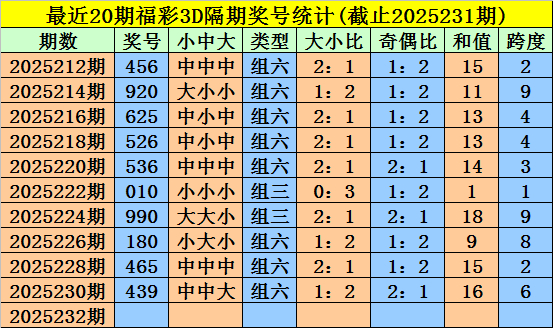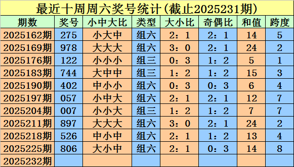 奖号类型判断:近期周六组六明显活跃,近十周开出7次,上周六为组六,组三出现较少,本周六看好在组六。