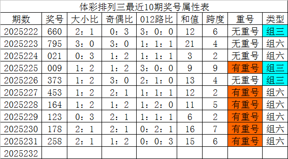 体彩排列三最近10期分别开出奖号:660、795、021、009、373、453、164、123、178、258,各奖号属性详见下表: