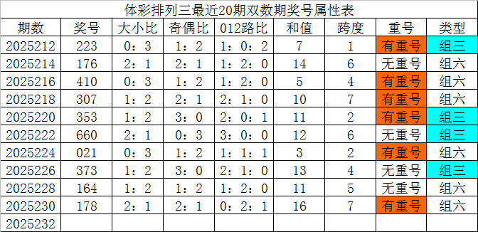 体彩排列三最近20期双数期奖号分别为:223、176、410、307、353、660、021、373、164、178,各期奖号详细属性下表: