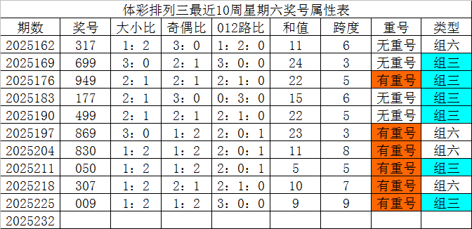 体彩排列三最近10周星期六奖号分别为:317、699、949、177、499、869、830、050、307、009,各奖号属性详见下表: