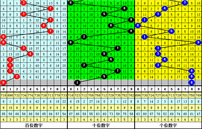 其中,号码0-9开出次数分别为:号码0开出4次、1开出5次、2开出3次、3开出6次、4开出2次、5开出1次、6开出4次、7开出4次、8开出1次、9开出0次。